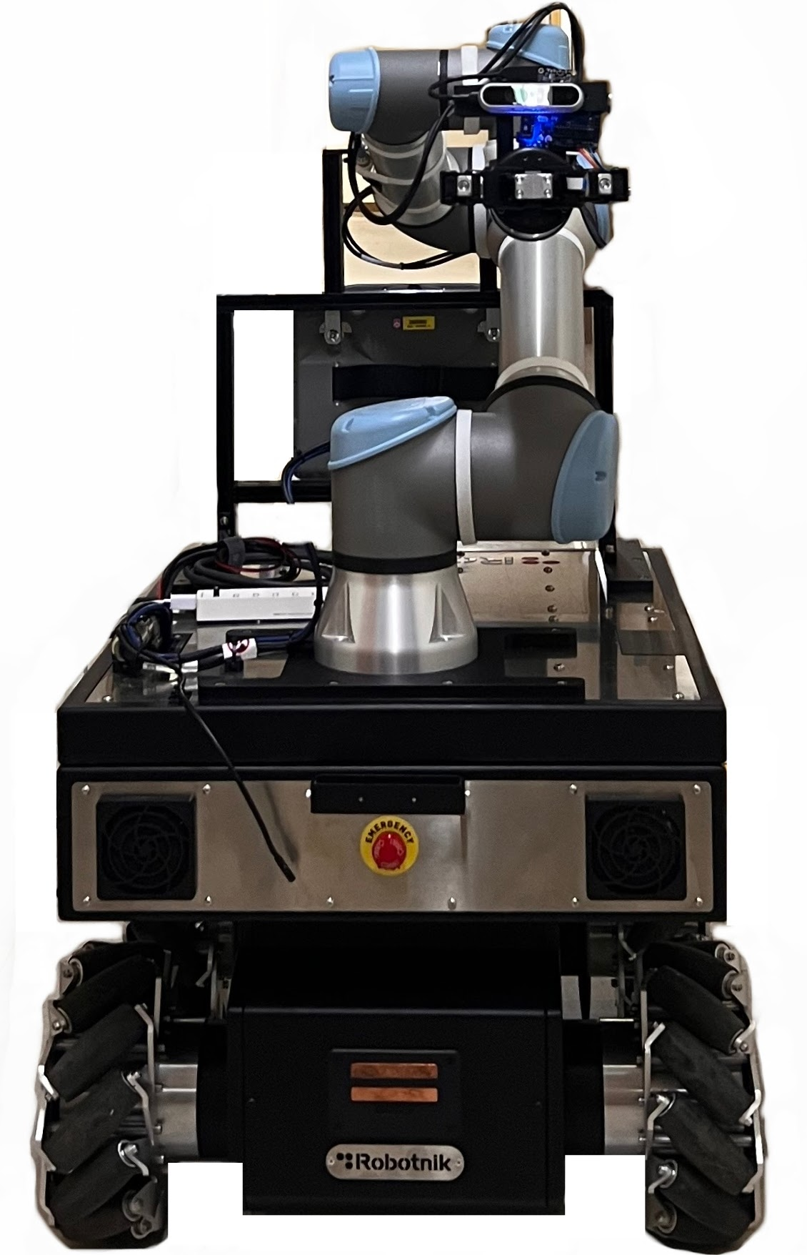 저희 연구실에선 다음과 같이 ROAS 회사의 Summit-XL과 UNIVERSAL ROBOTS의 UR5e를 결합한 모바일 매니퓰레이터 로봇을 사용합니다. 로봇의 그리퍼는 ROBOTIQ의 Robotiq 2F-85입니다.